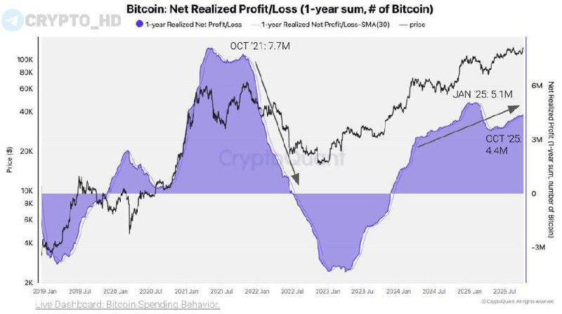 Уровень фиксации прибыли остается низким даже после обновления исторического максимума, а активность долгосрочных держателей минимальна – «старые» кошельки практически не перемещают BTC.