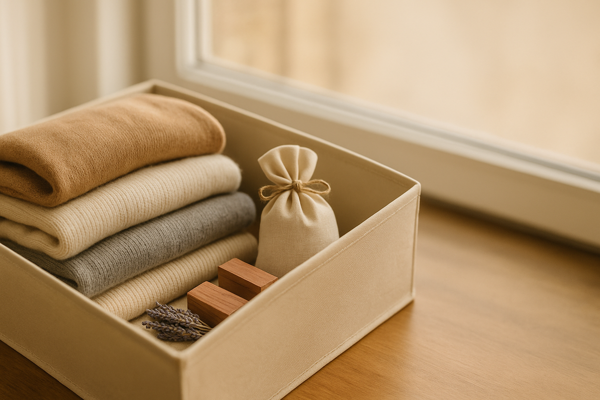 - Для свитеров — дышащие хлопковые мешки или боксы с тканевыми стенками. Пластик «парит» и даёт сырость.