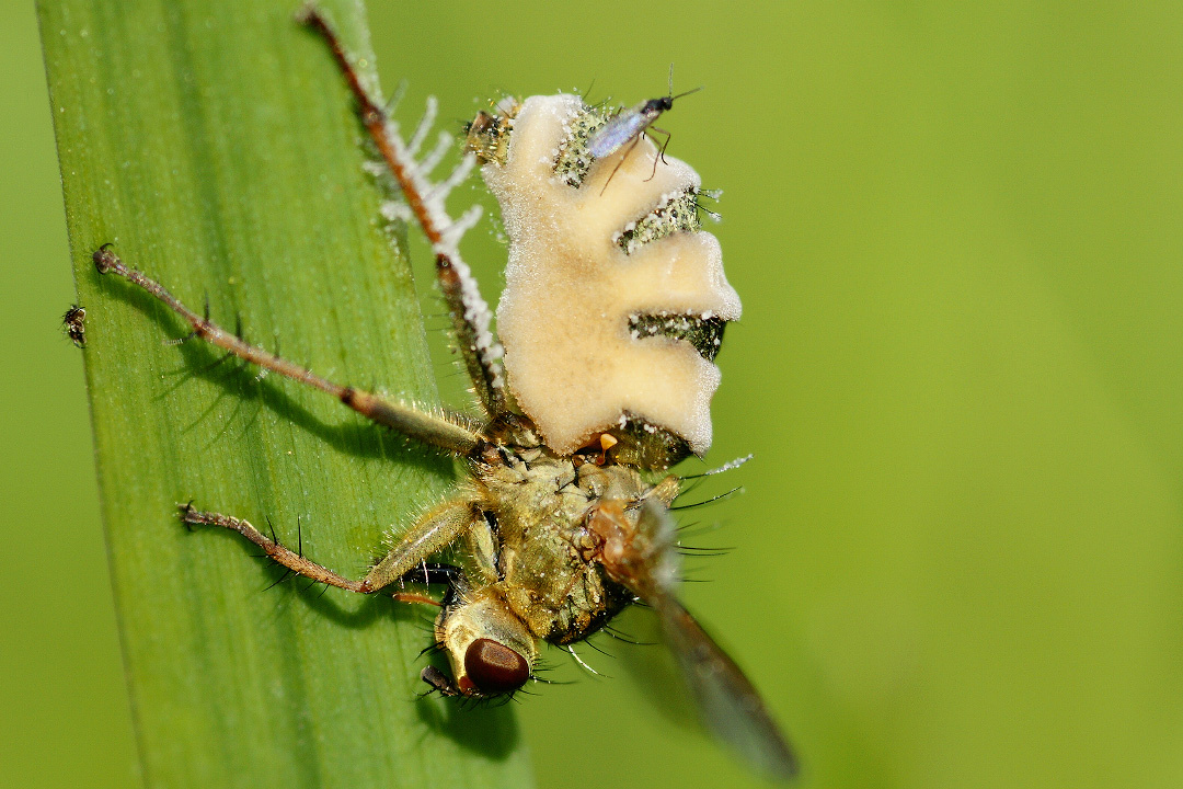 Привет, мои дорогие любители необычной земной фауны, сегодня я покажу вам одно из самых зловещих чудес природы — гриб, который умеет превращать мух в послушных кукол. Нет, это не метафора. Это тот случай, когда «зомби-апокалипсис» происходит прямо у нас под носом — на оконных рамах, в саду и даже на подоконнике у цветов. Начинается всё с крошечной споры, приземлившейся на крыло или брюшко ничего не подозревающей мухи. Через несколько часов гриб прорастает в тело жертвы, проникая в мышцы и нервы. И вот уже муха, внешне вполне бодрая, перестаёт быть собой: её полёт становится медленнее, траектории — подозрительно ровными, словно кто-то другой взял под контроль управление. Этот гриб — энтомофтора мушиная (Entomophthora muscae). Он относится к древней группе зигомицетов, но по точности поведения больше похож на программиста, чем на гриб. Он переписывает внутренние команды своей жертвы, заставляя её взбираться как можно выше, расправить крылья и застыть в идеально удобной позе — словно анте