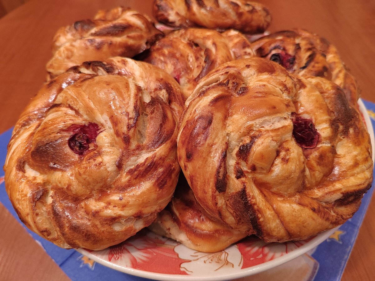 Рекомендую приготовить, самая простая выпечка и при этом очень вкусная. Готовится из слоёного теста, можно брать и дрожжевое, и бездрожжевое, будет вкусно, но из дрожжевого теста булочки будут попышнее. Вашего времени потребуется минут 20, никаких особых умений не нужно. Тесто разморозить, я беру 2 пачки. Час-полтора при комнатной температуре достаточно. В это время делаем начинку. 2 пачки творога, 4-5 ст ложек сахара, пакетик ванилина, немного корицы и 1 крупное яйцо перемешать блендером до однородной консистенции. Берем тесто, раскатывать его не надо. Одну пластину теста выкладываем на присыпанный мукой стол и немного растягиваем в одном направлении. На нее выкладываем половину начинки. Вторую пластину теста тоже немного растягиваем и накрываем первую половину теста. Ничего не формируем, края не трогаем, просто кладем пласт теста на нижний пласт с начинкой. Острым ножом разрезаем нашу заготовку вдоль на 5-6 полосок. Каждую полоску скручиваем в жгутик, при этом она становится длинне