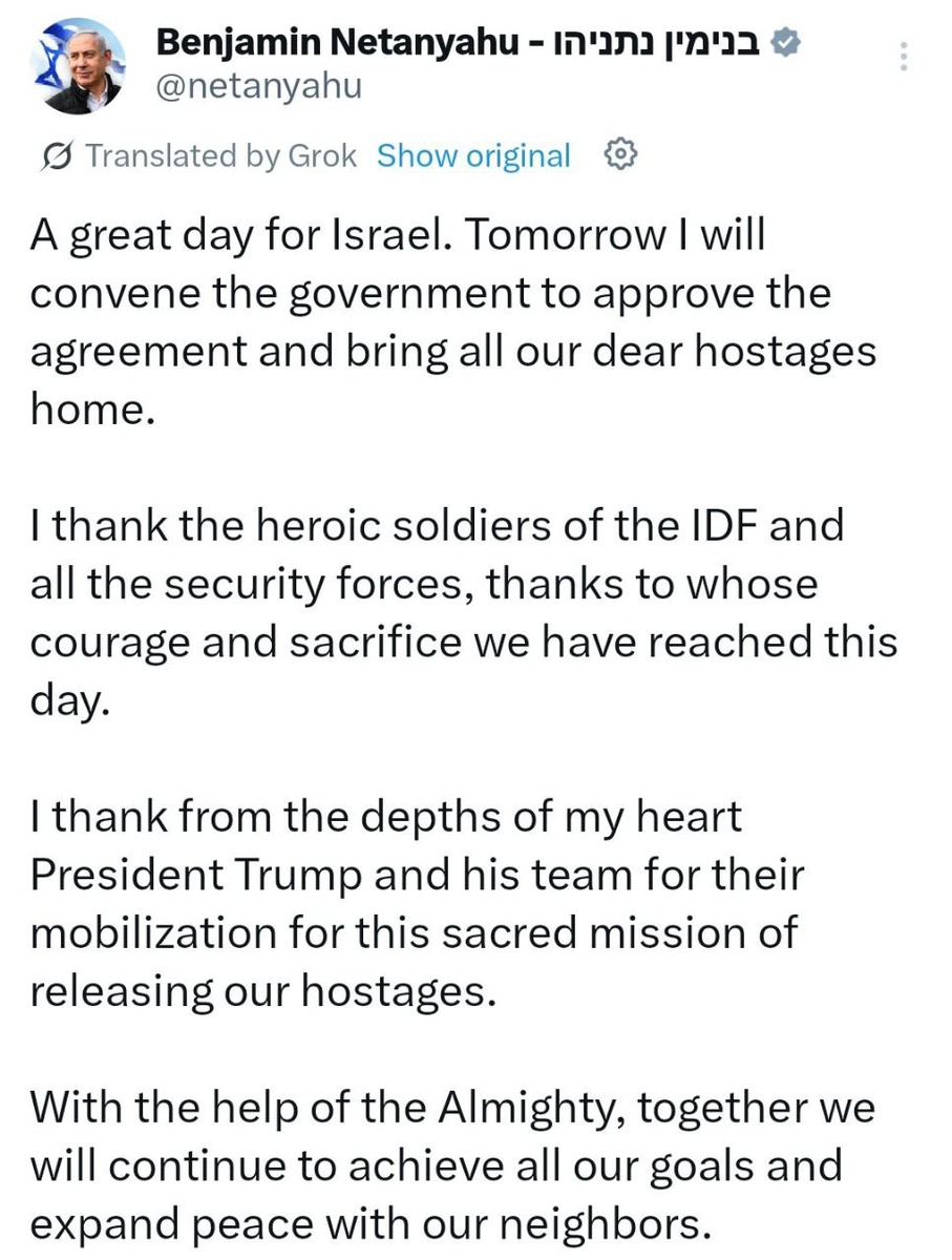 В ответ на пост More from Bibi just now: 'a GREAT day for Israel' Thanks Trump and co. for their help in 'sacred mission' to release hostages With God's help, he wants to 'expand peace with our neighbors'