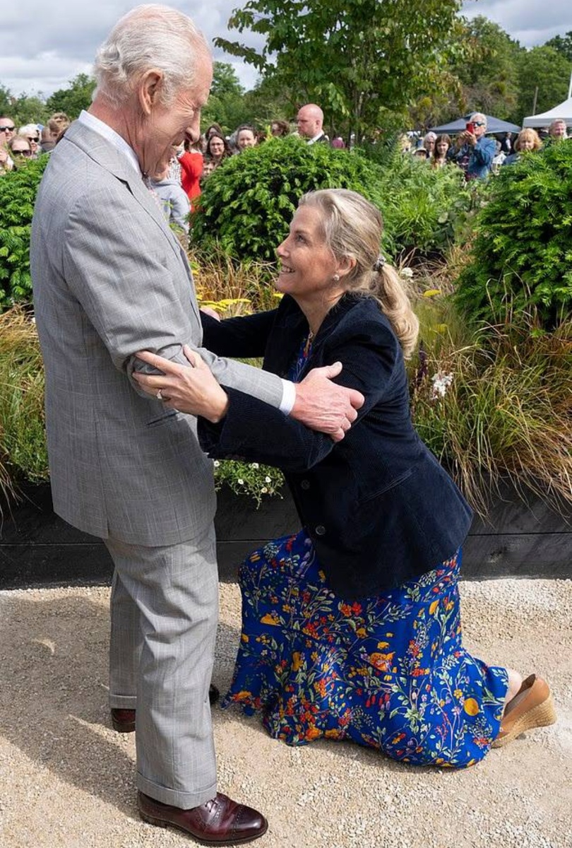 Вот уж никогда бы не подумала! Герцогиня Софи эта икона королевского приличия, которая за двадцать с лишним лет брака с принцем Эдвардом почти ни разу не оступилась ни в этикете, ни в моде, ни в публичных появлениях , вдруг едва не рухнула прямо перед королём Карлом на глазах у всей прессы. И всё из-за чего? Из-за проклятых танкеток и слишком ретивого желания показать уважение! Королевская выставка цветов в Виндзоре. Майское солнце, аромат роз, безмятежная атмосфера казалось бы, что может пойти не так на таком пасторальном мероприятии? Ну разве что герцогиня решила продемонстрировать реверанс настолько глубокий, что чуть не превратила церемониальное приветствие в акробатический номер. Элегантная Софи в очередном безупречном наряде видит короля и решает сделать реверанс. Казалось бы рутина, за годы при дворе она наверняка выполнила эту процедуру тысячи раз. Но тут коварные танкетки решили внести свою лепту в королевский протокол. Софи наклонилась так низко, словно кланялась н