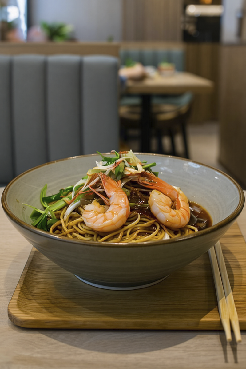 Вертикальная фотография аппетитного блюда, стоящего строго по центру кадра на столе. Камера под углом 45°, чтобы видны были верх и боковые текстуры. Фон один и тот же для всех изображений — стильный современный ресторан с деревянными столами, модным оформлением и мягким естественным освещением. Фон читаемый, но не отвлекающий. Тарелка полностью в кадре, посуда целиком помещается в изображение и остаётся в центре композиции. Свет мягкий и рассеянный, подчёркивает свежесть ингредиентов. Рядом с тарелкой аккуратно расположены приборы, соответствующие кухне блюда.