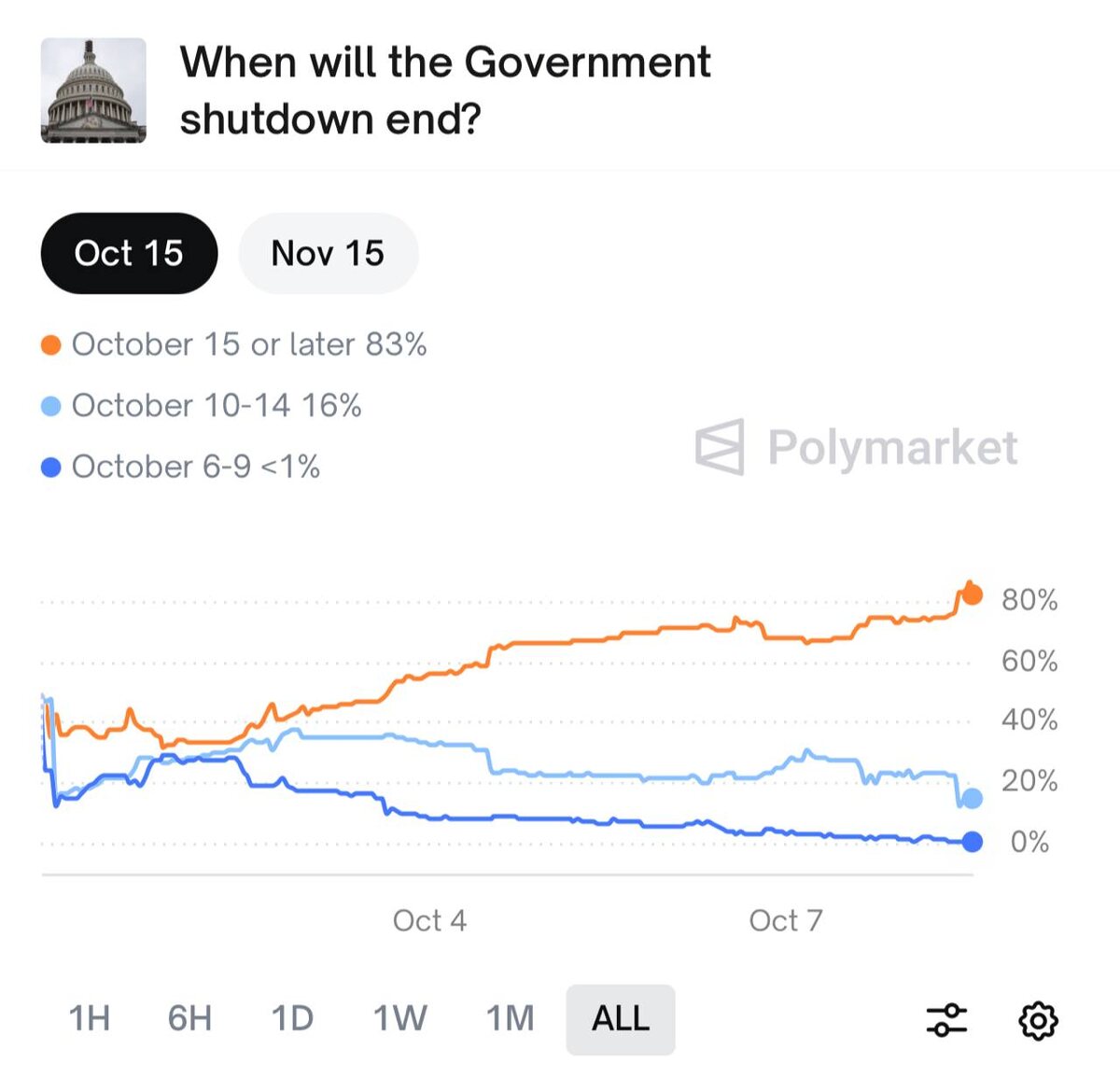 🔸Пользователи Polymarket оценивают вероятность того, что правительство США не будет работать после 15 октября, в 83%.