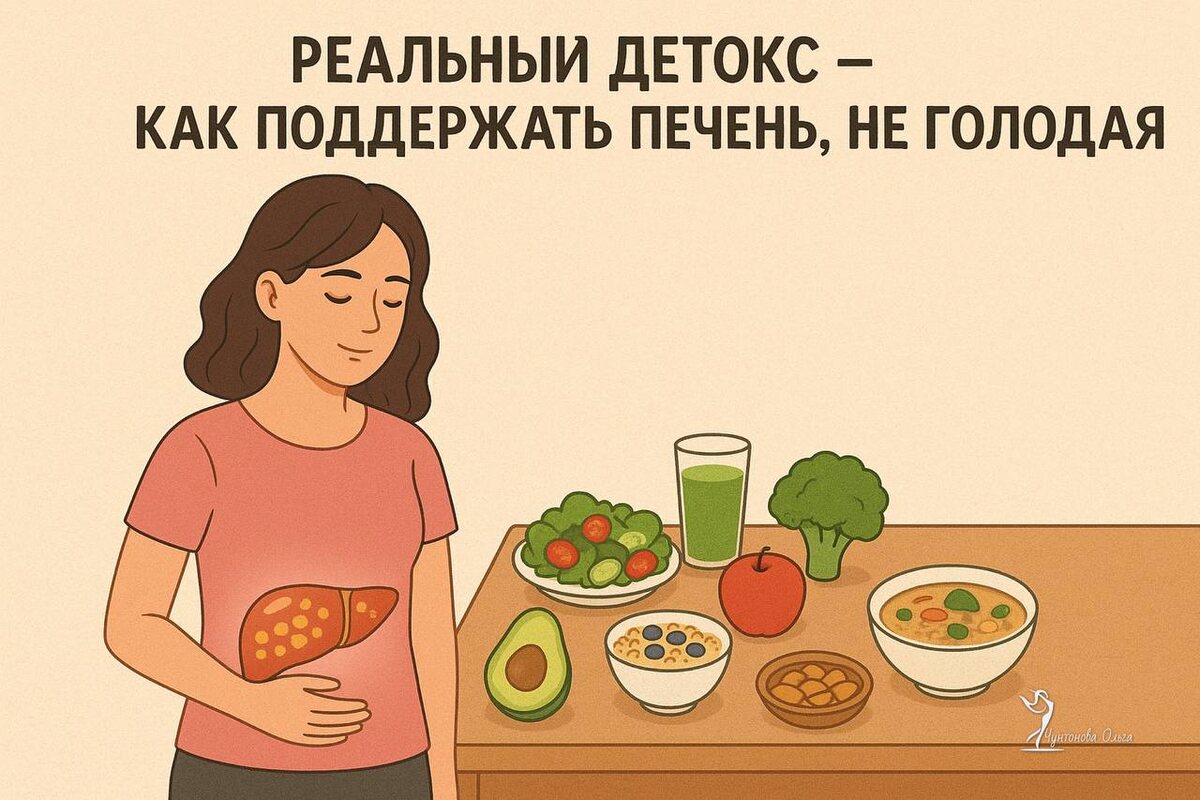 Реальный детокс — как поддержать печень, не голодая Поддержка печени — не про «чудо-чаи» и голодовки. Это про разумное питание и образ жизни, которые снимают нагрузку с органа и помогают ему естественно выводить метаболиты. Кратко — что действительно работает. Главные принципы • Не голодайте. Адекватный белок и калории нужны для восстановления. • Уберите алкоголь, трансжиры и лишний сахар. • Ешьте больше клетчатки (овощи, цельные злаки, бобовые) — она ускоряет выведение. • Включайте крестоцветные овощи (брокколи, цветная капуста), чеснок и лук — они стимулируют ферменты детоксикации. • Поддерживайте кишечник: ферментированные продукты и достаточная гидратация. • Сон, движение и управление стрессом — обязательны. Быстрые правила при готовке • Используйте оливковое масло, орехи и авокадо как источники полезных жиров. • Отдавайте предпочтение рыбе, курице, бобовым и яйцам — это «строительный материал» для печени. • Специи: куркума (с чёрным перцем), имбирь и лимон — работают в плюс. П