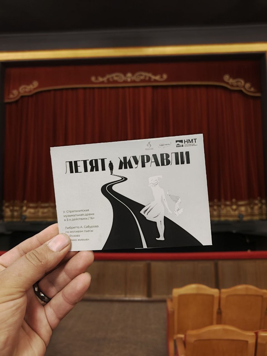 С Катей открыли театральный сезон! Новосибирский музыкальный театр порадовал нас долгожданной премьерой музыкальной драмой "Летят журавли". За основу была взята пьеса Виктора Розова "Вечно живые". Автор не понаслышке знал что такое война. Он как и герой пьесы Борис добровольцем ушел на фронт в июле 41 года. Но многим она известна по одноименному фильму с Алексеем Баталовым и Татьяной Самойловой. Это история любви на примере двух молодых влюбленных Бориса и Вероники, показана трагедия Великой Отечественной Войны, проходящую через историю одной семьи. Говорят: театр начинается с вешалки, но вчера он начинался в фойе. Потолок стал небом, а по нему летали журавли. Это очень круто когда добавляется мультимедиа. Я был очень впечатлён динамикой драмы, ни на секунду не прерывается линия повествования. Музыка, декорации выше всяких похвал. Приятно видеть что с каждым новым спектаклем артисты театра берут все выше и выше театральные планки.