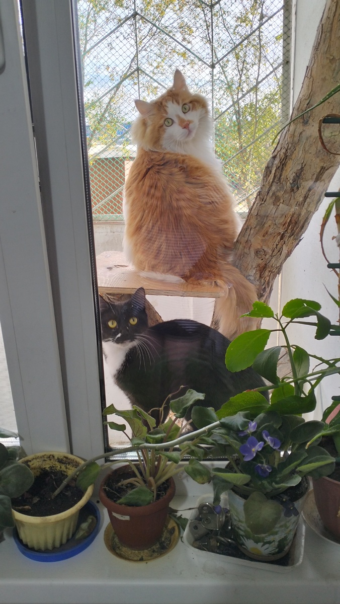 Саша вернулся из командировки и сразу же обтянул решетки балкона пластиковой сеткой, чтобы Марек больше не сбегал на улицу. Ещё Саша привез со старой квартиры дерево, на котором любили сидеть кошки и установил его на балконе - теперь у них там что-то вроде просторного вольера на свежем воздухе, часами могут сидеть и смотреть на улицу. Вообще, кошки довольно дружно живут вместе, иной раз только Марек немного треплет Фасольку. Фасольке уже больше года, но она так и осталось миниатюрной кошечкой. Помимо того, что кошки довольно независимые и важные создания, меня в них умиляет природное любопытство. Из недавнего вспомнила, как незадолго до переезда я сильно заболела и почти потеряла голос. Вернее он остался, но понизился на несколько тонов и стал каким-то металлическим. Решила немного побаловаться и этим новым голосом сказала: "Приветствую вас, носители инопланетного разума!" Надо было видеть с каким изумлением и испугом на меня уставились кошки, которые выстроились в коридоре и ост
