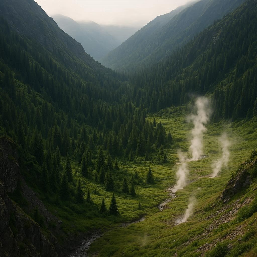 Прямо перед ними, за ущельем, открывалась долина. Небольшая, защищенная со всех сторон горами. И сквозь тонкую пелену тумана они увидели то, от чего у Дейна перехватило дыхание. Зелень. Настоящую, живую зелень хвойных деревьев. И струйки пара, поднимающиеся с земли в нескольких местах. Горячие источники.