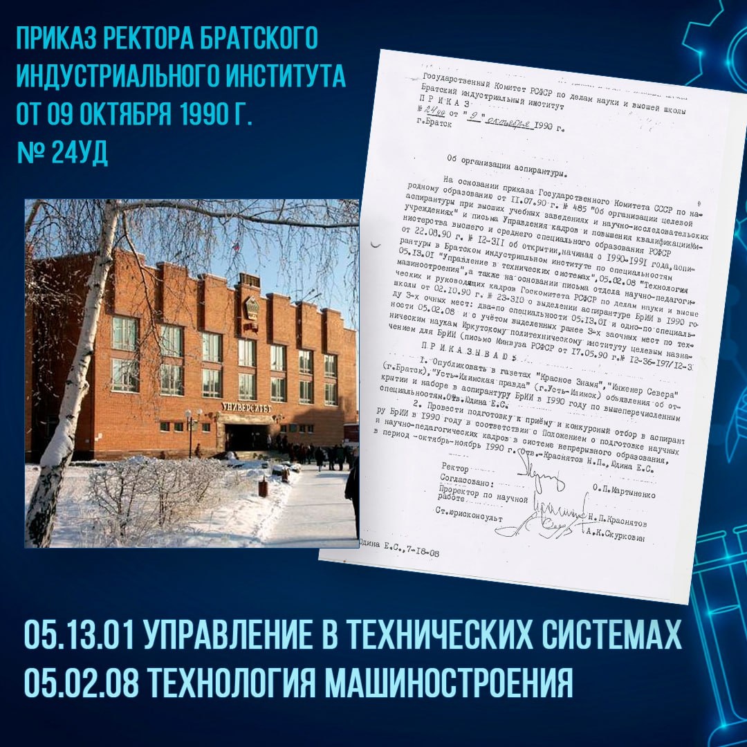Приказом ректора Братского индустриального института от 9 октября 1990 года № 24-уд официально объявлено об открытии аспирантуры и первом наборе аспирантов по вышеуказанным специальностям.