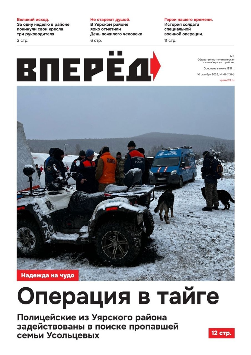 Вышел свежий помер газеты "Вперёд"! Читайте в новом выпуске: Великий исход. Всего за одну неделю свои кресла покинули три руководителя 3 стр Дело гендиректора. Прокуратура завела уголовное дело в отношении руководителя уярского предприятия. 3 стр. Операция в тайге. Уярские полицейские участвуют в поиске пропавшей семьи Усольцевых. 12 стр.
