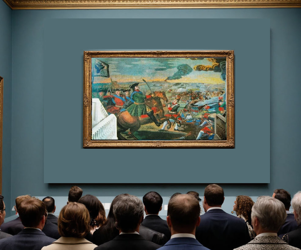 Картина мозаикой «Полтавская баталия» представляет собой грандиозное художественное произведение, посвящённое одному из важнейших событий русской истории — победе русских войск под командованием Петра I над шведской армией Карла XII в 1709 году. Уже при первом взгляде на композицию ощущается величие и драматизм момента. Мозаичная поверхность словно оживляет события, придавая им особую торжественность — каменные фрагменты сверкают и переливаются, создавая иллюзию движения и света. В центре изображения мы видим фигуру Петра I — он возвышается на боевом коне, уверенно управляя своим войском. Его лицо выражает сосредоточенность и силу воли, а поза наполнена решимостью. Вокруг — сцены ожесточённого сражения: конные и пешие солдаты, выстрелы, знамёна, рвущиеся вперёд, и клубы дыма от пушечных залпов. Мастер мозаики сумел передать динамику битвы, противопоставив упорядоченное построение русских войск хаотичному отступлению шведов. Особое внимание привлекает цветовое решение. Тёплые золотые и
