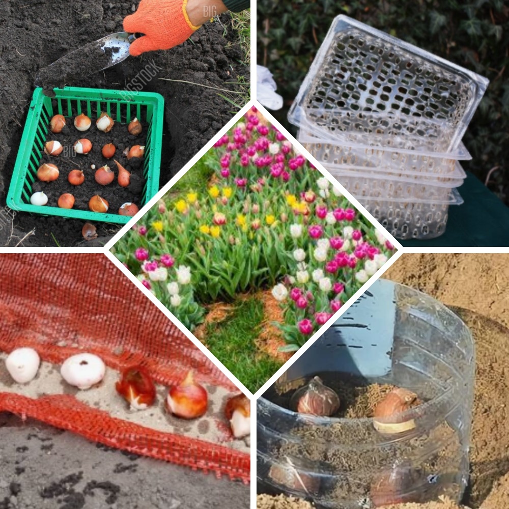Если у вас нет возможности приобрести специальные корзины, можно использовать пластиковые ящики-корзины из-под фруктов (застелить дно куском лутрасила или геотекстиля, чтобы предотвратить проваливание луковиц) или пластиковые пищевые контейнеры, бутыли и пр. (проделать отверстия в дне для дренажа).