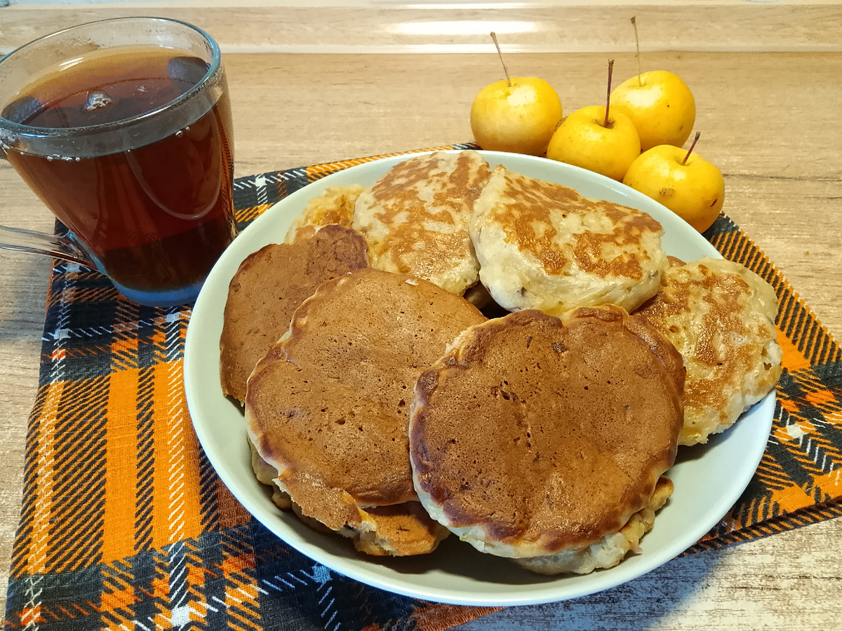 Я живу в Сибири, у нас уже наступила настоящая осень. Но яблоки в саду еще есть. Листья на яблоне уже почти все облетели, а яблоки висят. Жалко будет если они замерзнут. Поэтому яблоки собираю и готовлю вкусняшки. Сейчас, осенью, из яблок я готовлю пастилу. Сегодня решила приготовить яблочные оладьи. Яблоки для оладий можно взять любые. Если у вас яблоки крупные, будет достаточно пары штук. Яблоки вымойте и натрите на крупной терке. Добавьте яйцо, соль, сахар и соду. По желанию можно добавить чуть-чуть корицы. Яблоки и корица отлично дополняют друг друга. Все перемешайте. Влейте молоко и растительное масло. Еще раз перемешайте. Вмешайте в натертые яблоки муку. Тесто хорошо вымешайте и дайте ему постоять 5-10 минут. Ложкой выложите тесто на сухую сковороду. Жарьте оладьи на сковороде с антипригарным покрытием, под крышкой, на огне ниже среднего. Жарьте оладьи до тех пор, пока они не станут матовыми. Затем оладьи переверните и готовьте их еще 3-5 минут, вновь под крышкой. Пышные, вкусны