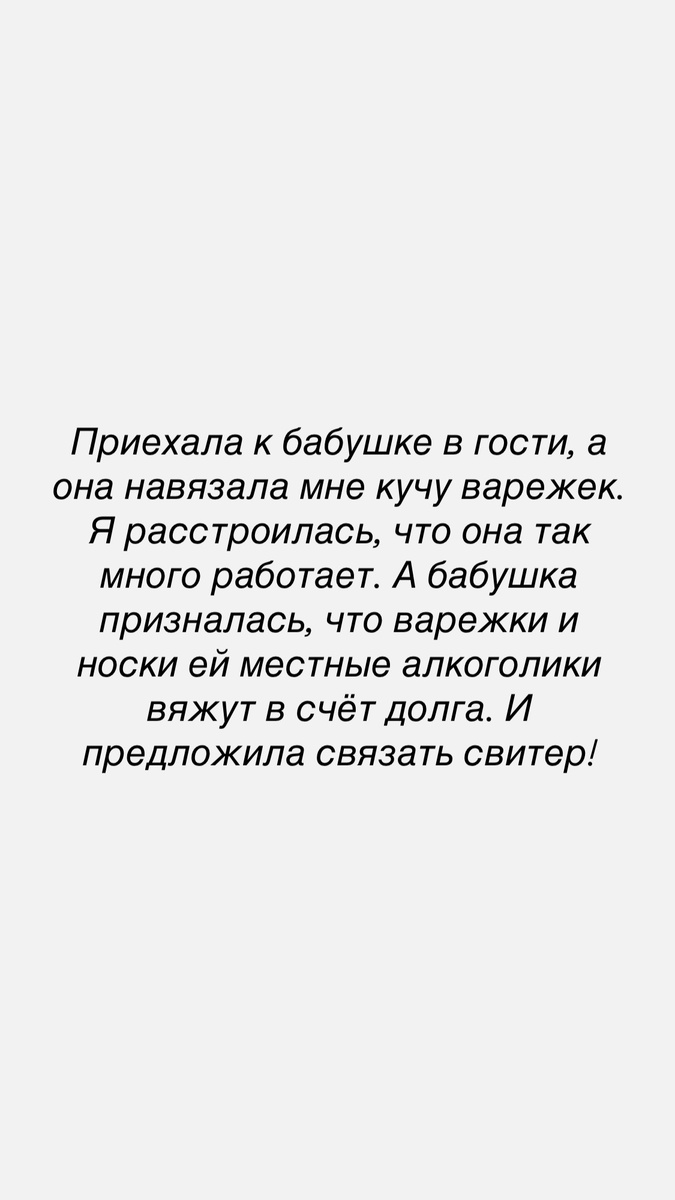 Работаю на новом месте уже 7 месяцев. В первый день познакомился с охранниками, угостил их кофе. Получил пропуск и начал просто прикладывать сумку к турникету. Иногда получалось пройти быстро, иногда «застревал» на 5 секунд. Вчера пропуск впервые не сработал, пришлось доставать. Сегодня охранники признались, что все 7 месяцев они просто нажимали кнопку, чтобы меня пропустить, и иногда специально ждали 5 секунд — ради шутки! Приехала к бабушке в гости, а она навязала мне кучу варежек. Я расстроилась, что она так много работает. А бабушка призналась, что варежки и носки ей местные алкоголики вяжут в счёт долга. И предложила связать свитер! История про парня, которого заставляли ездить на дачу окучивать картошку. Бабушка пообещала ему заплатить за работу. Внук так воодушевился, что пахал 3 часа под солнцем. Когда бабушка спросила, на что он потратит деньги, он ответил: «Найму рабочих, чтобы они всё делали, а меня здесь больше не увидите!» За окном офиса — стройка с подъёмным краном. Кр