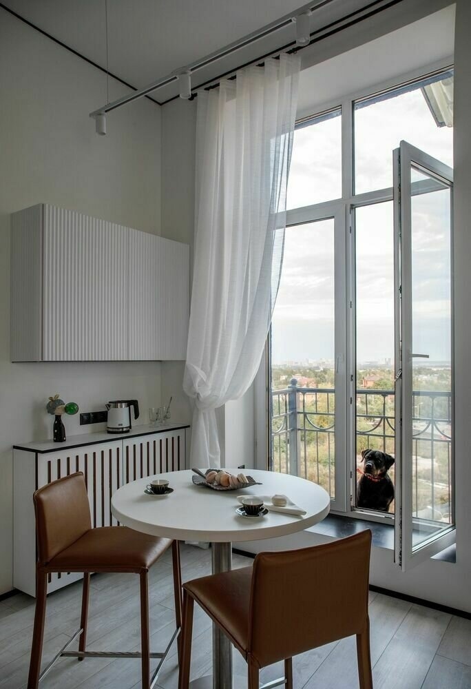 За что люблю квартиры в старом фонде, так это за количество и размер окон, и за высокие потолки. Этот проект дизайнера Татьяны Архангельской прекрасно показывает огромные возможности по перепланировке в таких квартирах. Площадь объекта 36 м2. В квартире организовано грамотное зонирование, есть все необходимое для проживания 1-2 человек: небольшая кухня, компактная обеденная зона, полноценная спальня, санузел с возможностью сушки белья, гардеробная. Обратите внимание, как обои с архитектурным рисунком расширяют пространство и влияют на его восприятие (фото ниже) и как растворяется в пространстве шкаф с зеркальными фасадами (это же фото, справа от кушетки). Единственное, что вызывает у меня недоумение - это кушетка. Для полежать есть полноценная кровать, а сидеть удобно на этой кушетке просто невозможно, да и лежать долго неудобно (тем более смотреть телевизор). Даже на фото видно, что ее таскают из угла в угол - то к телевизору, то к окну. Я бы ее заменила парой легких удобных кресел в