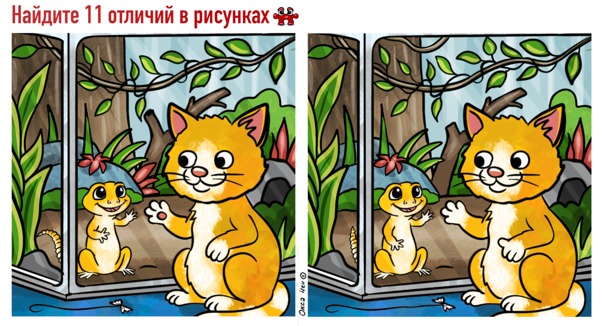 Всем хорошего дня! Сложный был месяц, времени заниматься картинками почти не было. Каждый новый рисунок для меня большая радость - прекрасно когда есть возможность заниматься любимым делом. Сегодня после долгого перерыва начинаю новую серию публикаций. У нас дома завелась парочка обаятельнейших улыбашек эублефаров, сюжет просится сам собой. Знакомство рыжего котика с рыжим геккончиком. 11 отличий ждут чтобы их нашли!
