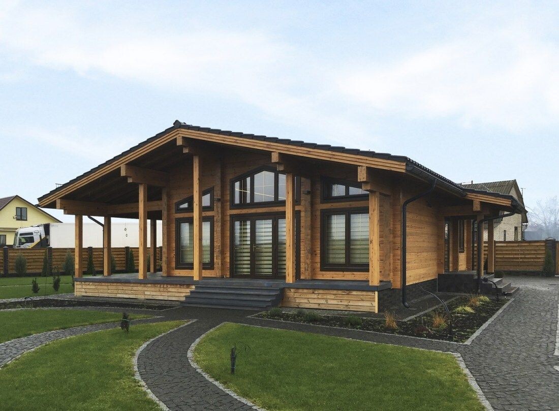 Дом: Из клееного бруса, площадью 580 м², расположенный в Московской области. В доме 4 санузла и изолированный бассейн.