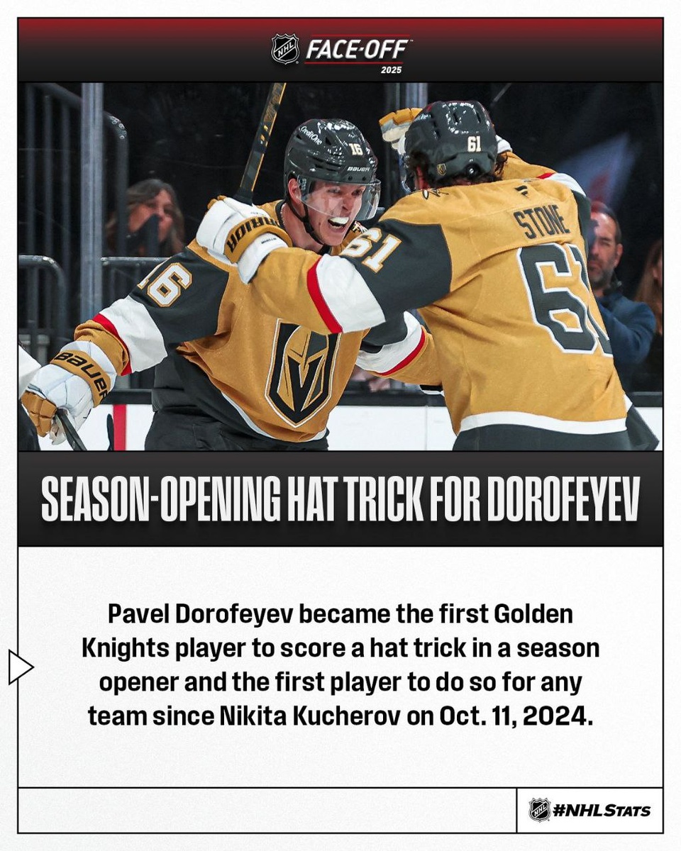 💵 Последние два года россияне открывают счёт хет-трикам в сезонах Дорофеев в прошлом сезоне стал главным снайпером «Вегаса», если кто забыл. Посмотрим, как в этот раз пойдут дела. Пока начал Паша очень бодро. ⬇️ Чат #нхл #nhl