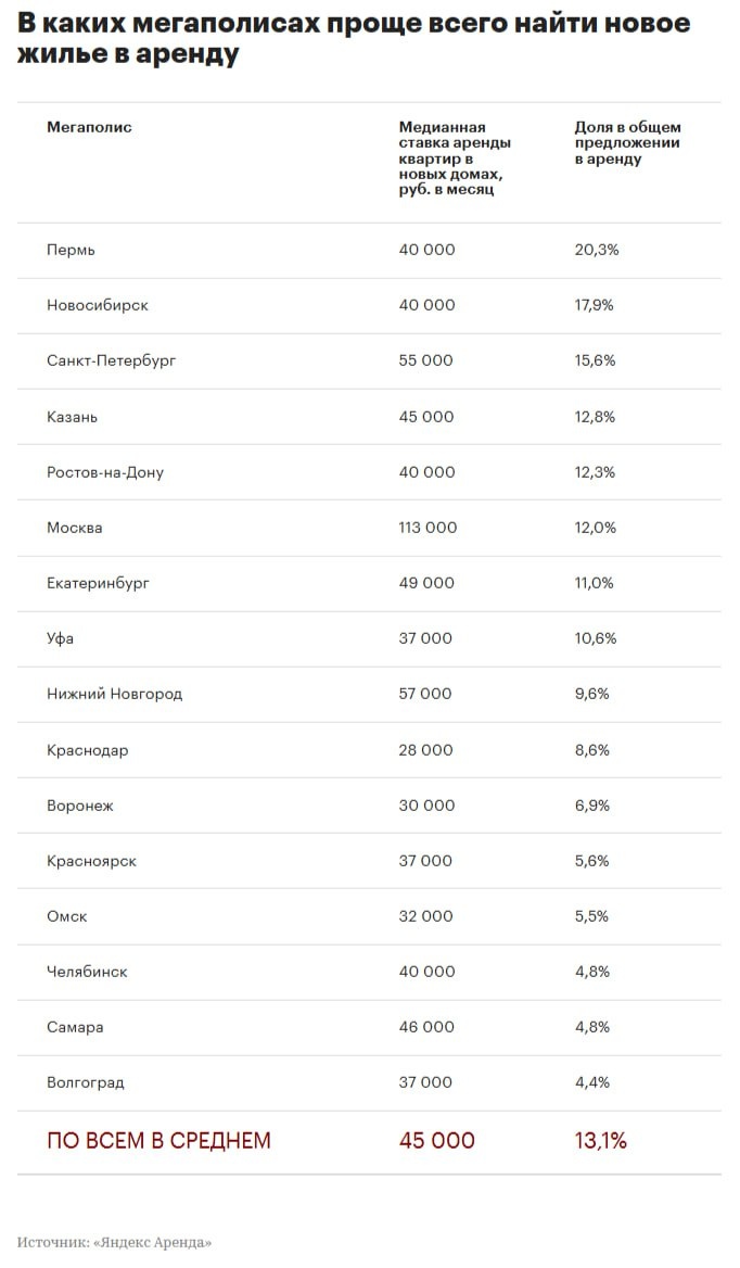 В октябре доля арендного жилья в новых домах (построенных после 2020 года) в российских городах-миллионниках составила в среднем 13,1%. • Лидеры — Пермь, Новосибирск и Санкт-Петербург. • Пермь — 20,3% предложений, медианная ставка 40 тыс. ₽/мес. • Новосибирск — 17,9%, 40 тыс. ₽. • Санкт-Петербург — 15,6%, 55 тыс. ₽. Для сравнения, в Москве на квартиры в домах не старше пяти лет приходится 12% аренды — в среднем 113 тыс. ₽ в месяц. Наименьшая доля новых квартир — в Волгограде (4,4%), Самаре (4,8%) и Челябинске (4,8%).