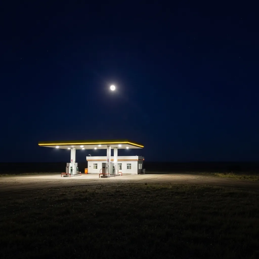 Когда я подписывал бумажки у начальника смены, запах старой бумаги и высохшей шариковой пасты смешался в голове с бензиновыми испарениями — такой коктейль, после которого понимаешь: возвращаться некуда. Заправка стояла в чистом поле, 147 километров до ближайшего поселка, если верить навигатору, и еще дальше до тех мест, где в ночных окнах горит не луна, а чьи-то лампы. Здесь за свет отвечали пять холодных прожекторов и стойка с автоматом для кофе, который всегда отдавал железом, как кровь на языке. Мне обещали тишину, надбавку за ночные, и редкие фуры, заезжающие за соляркой. Меня устраивало: чем меньше людей, тем меньше объяснять, почему ты здесь, а не там, где тебя ждали. Если бы ждали.