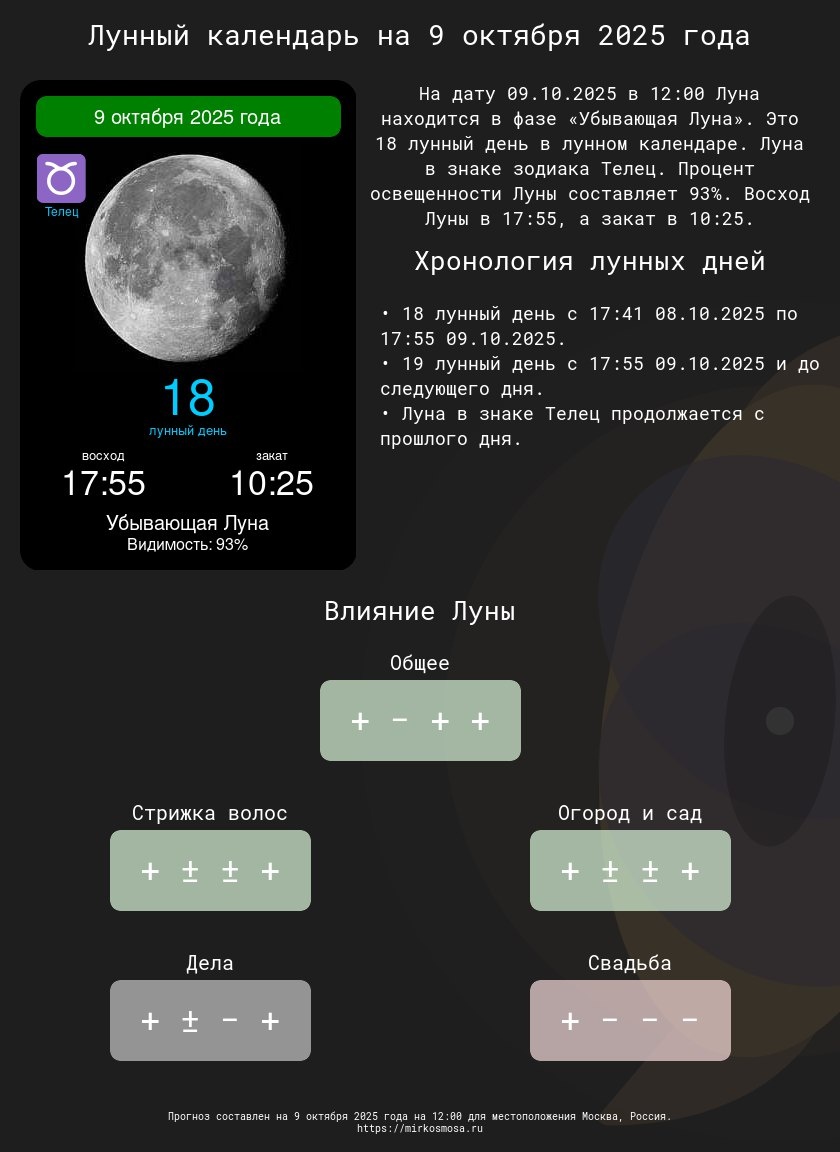 Лунные календари на 9 октября 2025 года: Подготовьтесь к этому дню с учетом влияния Луны! 🔹🌗 Лунный календарь на 9 октября 2025 года — Что приготовила Луна? Подробнее 🔹✂️ Лунный календарь стрижек на 9 октября 2025 года — Подходящий ли день для обновления прически? Подробнее 🔹🌱 Лунный календарь огородника и садовода на 9 октября 2025 года — Лучшее время для ухода за растениями. Подробнее 🔹📅 Лунный календарь дел на 9 октября 2025 года — Удачные моменты для важных задач. Подробнее 🔹💍 Лунный календарь свадеб на 9 октября 2025 года — Подходит ли этот день для вашего торжества? Подробнее