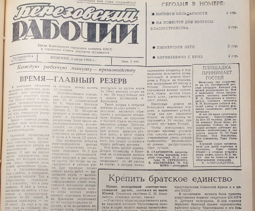 В начале июля в нашем городе прошли митинги, посвященные советско-чехословацкой дружбе. Трудящиеся рудника имени Кирова, Лосиного торфопредприятия, Монетного трактороремонтного завода, БСУ, ковроткацкой фабрики и других предприятий обсуждали письмо участников общегосударственного актива народной милиции Чехословакии к советскому народу, в котором они заявляли «о своей решимости крепить братскую дружбу с СССР». Собраниями было принято решение направить приветственную телеграмму в адрес президента Чехословакии Людвика Свободы с выражением братских чувств рабочему классу Чехословакии и народной милиции ЧССР.