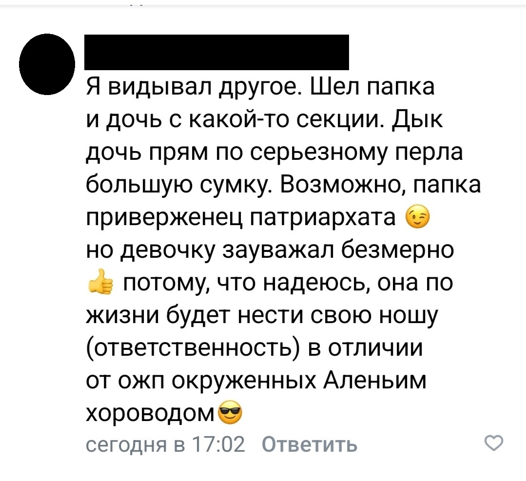 Увидела один замечательный комментарий и, конечно, не смогла пройти мимо: Мне кажется, в этом комменте прекрасно все. Просто идеально. Но - по порядку. во-первых, у автора очень странные понятия о патриархате. Он действительно думает, что "патриархат" - это когда женщина тянет непосильную нагрузку, а мужчина, посвистывая, идет рядом налегке? Грубое, но точное слово "перла" доказывает, что в сумке девочки действительно было что-то тяжелое, а не какие-нибудь объемные и невесомые крылышки феи. То есть, после занятий спортом, уставшая, девочка несет тяжести, а "патриарх" спокойно наблюдает за этим. Насколько я знаю, патриархат - это когда мужчина главный. Не в смысле, руководит и раздает команды, а именно принимает решения и, самое главное, несет за них ответственность. А здесь говорится об ответственности... девочки, а не ее отца. И, положа руку на сердце - какая же это ответственность? Это самое обычное равнодушие и пренебрежение. И, в первую очередь, здоровьем ребенка. Кто знает, как