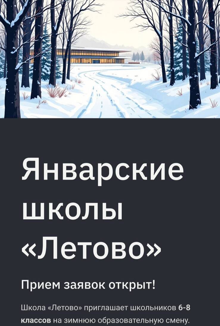 Январские школы «Летово» 2-7 января 2026 г. очно на базе школы бесплатно Школа "Летово" приглашает школьников 6-8 классов на зимнюю образовательную смену. В Январских школах могут участвовать ученики со всей России. Направления Январских школ: 🤍6 класс — биология, астрофизика, инженерные технологии 🤍7 класс — математика+ 🤍8 класс — физика Заявки на участие принимаются до 3 ноября. Подробнее по ссылке. Отборочные тестирования пройдут 8-9 ноября 2025 г. Каждая Январская школа разработана для класса, в котором учится ребенок в этом учебном году. Направления школ не связаны с профилями поступления. Главное - интерес ребенка! Бонусы для участников: 1) почувствовать ритм жизни в "Летово" 2) общение и обучение в атмосфере "Летово" 3) знакомство с учителями школы 4) привилегии для поступления Все участники очного тура получают допуск к очным вступительным экзаменам в школу "Летово", которые пройдут в марте. Сдавать контрольные тестирования не нужно. Некоторым участникам может быть за