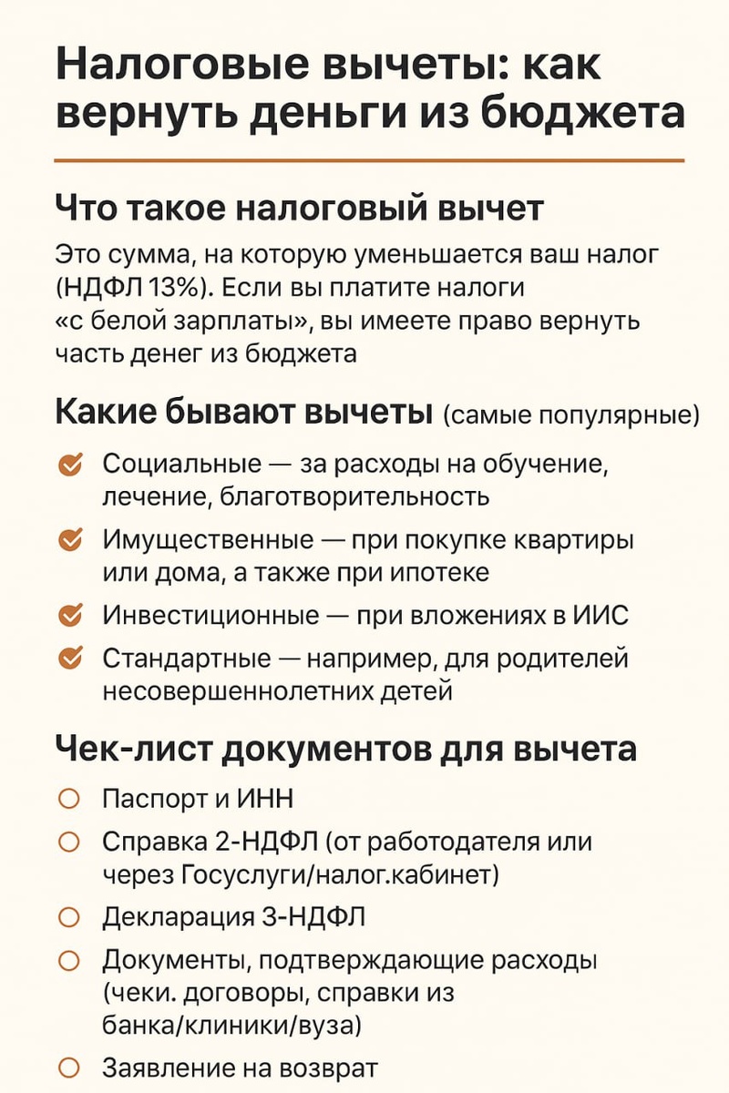 🧐 Налоговые вычеты: как вернуть деньги из бюджета? 💰 Большинство людей думают о налогах только как о расходе. Но есть и хорошая новость: государство готово возвращать часть уплаченных налогов — если вы знаете, как этим воспользоваться. Это и есть налоговые вычеты. 🔹 Что такое налоговый вычет Это сумма, на которую уменьшается ваш налог (НДФЛ 13%). Если вы платите налоги «с белой зарплаты», вы имеете право вернуть часть денег из бюджета. 🔹 Какие бывают вычеты (самые популярные) ▪️ Социальные — за расходы на обучение, лечение, благотворительность. ▪️ Имущественные — при покупке квартиры или дома, а также при ипотеке. ▪️ Инвестиционные — при вложениях в ИИС (индивидуальный инвестиционный счёт). ▪️ Стандартные — например, для родителей несовершеннолетних детей. 🔹 Чек-лист документов для вычета ✔️ Паспорт и ИНН ✔️ Справка 2-НДФЛ (от работодателя или через Госуслуги/налог.кабинет) ✔️ Декларация 3-НДФЛ ✔️ Документы, подтверждающие расходы (чеки, договоры, справки из банка/клиники/вуза) ✔