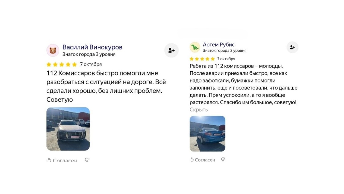 Каждый, кто хоть раз попадал в ДТП, знает, насколько это стресс. Но клиенты 112 Комиссаров уверены — с нашей помощью даже неприятная ситуация превращается в упорядоченный процесс, где всё решается быстро, грамотно и с заботой. Мы берём на себя оформление, консультации, ремонт и контроль качества. Именно поэтому наши клиенты уходят с улыбкой, а не с головной болью. “Ребята из 112 Комиссаров – молодцы. После аварии приехали быстро, всё как надо зафоткали, бумажки помогли заполнить, ещё и посоветовали, что дальше делать. Прям успокоили, а то я вообще растерялся. Спасибо им большое, советую!” ✅ Даже в самый напряжённый момент наши специалисты сохраняют спокойствие и уверенность. Комиссары берут всё под контроль: фиксируют место происшествия, помогают заполнить документы и объясняют, какие шаги нужно предпринять. Человеческое отношение и профессионализм — то, что особенно ценят наши клиенты. “112 Комиссаров быстро помогли мне разобраться с ситуацией на дороге. Всё сделали хорошо, без лишни