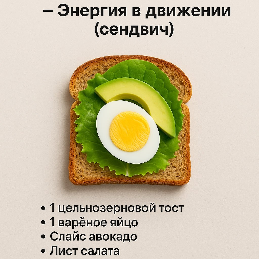 4️⃣ Четверг — Энергия в движении (сендвич) 1 цельнозерновой тост🍞 1 варёное яйцо 🥚 Слайс авокадо 🥑 Лист салата 🥬 Капля лимонного сока 🍋 👉 Упакуй с собой — идеален перед утренней тренировкой. Слово Акробата * Буст канала * Прислать свое видео * Поздравления!