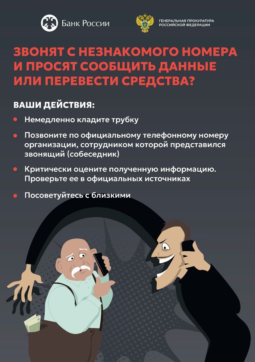 👮 Как не стать жертвой мошенников Если «работник банка», «правоохранительных органов» по телефону просит сообщить номер банковской карты, код на обратной стороне карты, смс-пароли и коды, поступившие на телефон, перевести деньги на «безопасный счет», оформить кредит или перевести деньги через банкомат – не верьте, это мошенники! Помните, сотрудники банков и правоохранительных органов никогда не просят предоставить данные сведения. Если продавец или покупатель на Интернет-сайте просит пройти к банкомату для операций или сообщить ему номер карты и смс-пароли и коды, поступившие на телефон – Не верьте, это мошенники! Если Вам поступил звонок о том, что родственник находится в беде, и требуются деньги для разрешения ситуации — не верьте, это мошенники. Свяжитесь с близким человеком, проверьте информацию. Будьте осторожны и внимательны!