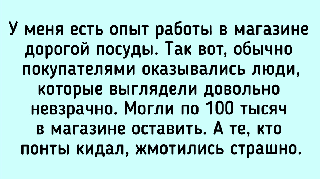 У меня есть опыт работы в магазине дорогой посуды. Так вот, обычно покупателями оказывались люди, которые выглядели довольно невзрачно. Могли по 100 тысяч в магазине оставить. А те, кто понты кидал, жмотились страшно. © Федосья Ивановна / ADME