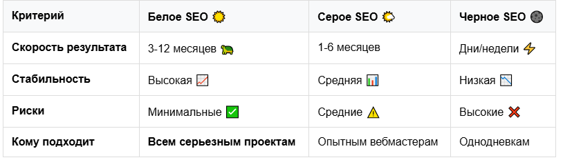 Представьте: ваш сайт видят именно те люди, которые ищут ваш товар или услугу. Они приходят готовыми к покупке и доверяют вам. Это не мечта — это результат грамотной SEO-оптимизации. SEO (Search Engine Optimization) — это не просто «быть в топе». Это системная работа над сайтом, чтобы он отвечал требованиям поисковых систем и потребностям пользователей. Представьте, что ваш сайт — это книга в огромной библиотеке. SEO — это картотека, которая помогает читателю найти именно вашу книгу среди миллионов других. Основа, без которой всё рушится То, за что вас полюбят пользователи То, что убеждает поисковики в вашей экспертности Вывод: Для долгосрочного бизнеса выбирайте только белые методы. Они надежны и безопасны. SEO — это марафон, а не спринт. Первые результаты появятся через 3-6 месяцев, но зато они будут стабильными и долгосрочными. Золотое правило: Создавайте сайт для людей, а не для роботов. Поисковые системы всегда на стороне пользователя, и ваш успех зависит от того, насколько хорошо