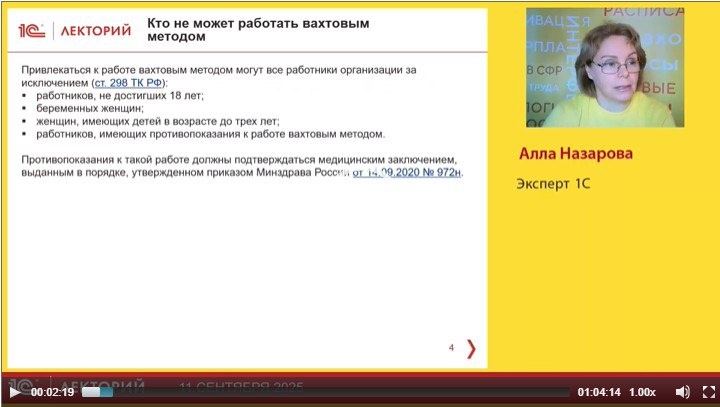 ❓Кто не может работать вахтовым методом рассказала Алла Назарова, эксперт 1С, преподаватель Учебного центра №1 фирмы 1С в лекции на тему: Работа вахтовым методом в 2025 году на примере 1С:ЗУП, ред.3 Дополнительно доступна презентация лектора. 👉 Смотрите бесплатно полную видеозапись лекции 🚨Подписывайтесь на @lector_1c