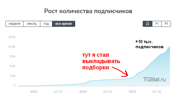 Подборки летят в избранное, кто-то делится ими с друзьями, иногда админ какого-нибудь канала делает репост. Так пост собирает больше пересылок и, как следствие, растет число новых подписчиков на канале.