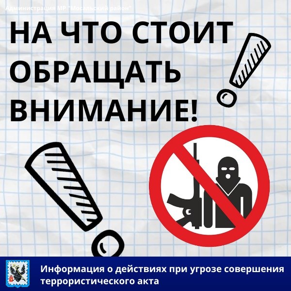 ☝️В наше время очень важно быть бдительными и внимательными! 📍Друзья, не игнорируйте подозрительные предметы, найденные в общественных местах. Не бойтесь показаться излишне осторожным, если заметили странное поведение человека, характерное для преступника. Обо всех подозрительных ситуациях незамедлительно сообщайте сотрудникам правоохранительных органов, оказывайте им необходимое содействие. ❗Помните, что ваша бдительность может спасти жизни! 👉 Подробнее о действиях граждан в условиях угрозы совершения террористического акта читайте здесь ➡️ https://clck.ru/3PdfDH Официальный сайт Национального антитеррористического комитета ➡️ http://nac.gov.ru/ #АдминистрацияМРМосальскийрайон #АнтитеррористическаяБезопасность