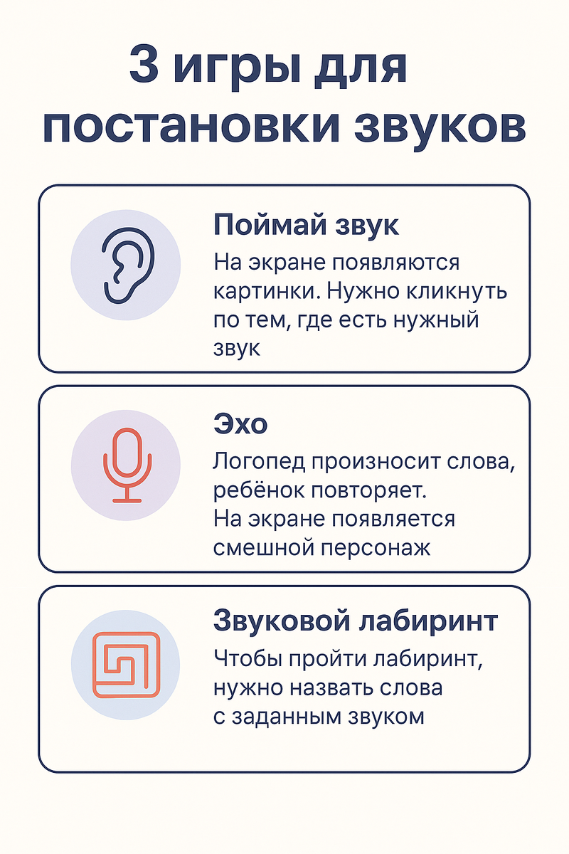 Когда ребёнок неправильно произносит звуки, исправлять это можно не скучными упражнениями, а играми. Онлайн-занятия делают процесс весёлым — ведь экран превращается в игровую площадку для тренировки речи. Почему игры работают лучше: – ребёнок расслаблен и не боится ошибок; – внимание удерживается дольше, чем на обычных упражнениях; – каждое задание превращается в маленькую победу. 3 онлайн-игры для постановки звуков: «Поймай звук» На экране появляются картинки. Нужно кликнуть по тем, где слышится нужный звук (например, «С» — солнце, самолёт, слон). «Эхо» Логопед произносит слова, ребёнок повторяет — как эхо. На экране появляется смешной персонаж, который «одобряет» правильное произношение. «Звуковой лабиринт» Чтобы пройти лабиринт, нужно назвать слова с заданным звуком. Каждый правильный ответ открывает новый путь. Онлайн-формат даёт свободу: педагог видит и слышит ребёнка, может давать мгновенную обратную связь, а игры создают атмосферу лёгкости и радости. Вывод: постановка зв