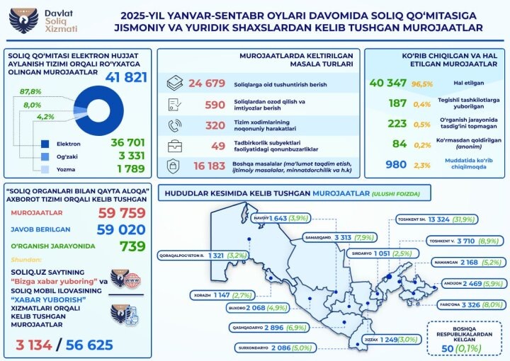 В Налоговый комитет Республики Узбекистан за период с января по сентябрь 2025 года поступило 41 821 обращение граждан и юридических лиц, - сообщает пресс-служба ведомства. Обращения были зарегистрированы в центральном аппарате через систему электронного документооборота, что позволило обеспечить их оперативную обработку и контроль сроков рассмотрения.