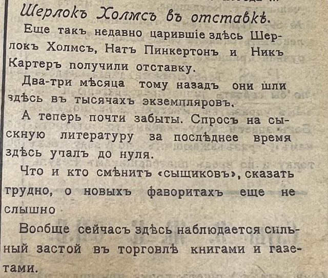 Шерлок Холмс в отставке газета "Старый Владимирец", май 1909 «Вообще сейчас здесь наблюдается сильный застой в торговле книгами и газетами» Музей детектива (Владимир)