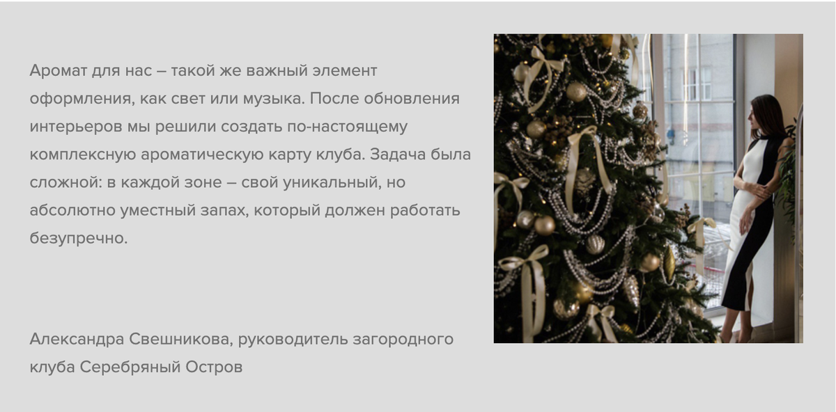 Загородный клуб «Серебряный Остров» хорошо знаком с силой аромамаркетинга и успешно использует его многие годы, ароматизируя входную зону, ресторан и уборные для клиентов. Однако после масштабной реновации встала задача не просто обновить концепцию ароматизации помещений клуба,а вывести ее на принципиально новый уровень. Целью было создать целостное, но многогранное сенсорное путешествие для гостя, где переход из спортивного комплекса в ресторан или из тренажерного зала в зону Spa сопровождался бы сменой атмосферы, подчеркнутой тщательно подобранным ароматом. Команде клуба было критически важно, чтобы каждая отдушка работала на усиление эмоций и функционального назначения пространства. В здании клуба используется гибридное решение, сочетающее