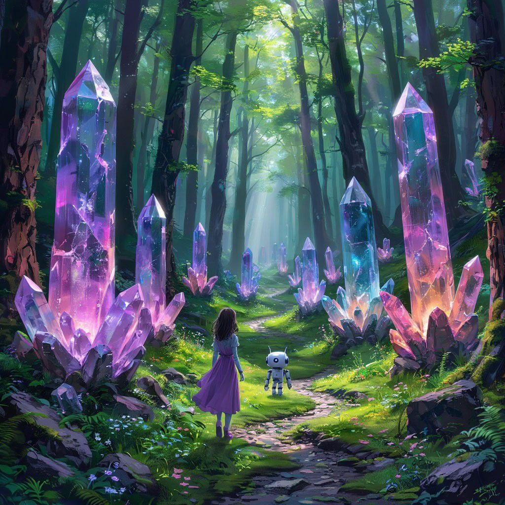 Айла шагала по извилистой тропе, петляющей между исполинскими кристаллами. Каждый из них излучал мягкий свет, окрашивая лес в причудливые оттенки — от лазурного до рубинового.
