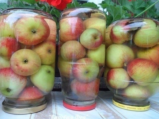 Крeпкие яблоки, желательно поздних зимних сортов, сложить в 3-х литровые банки, залить холодной водой.