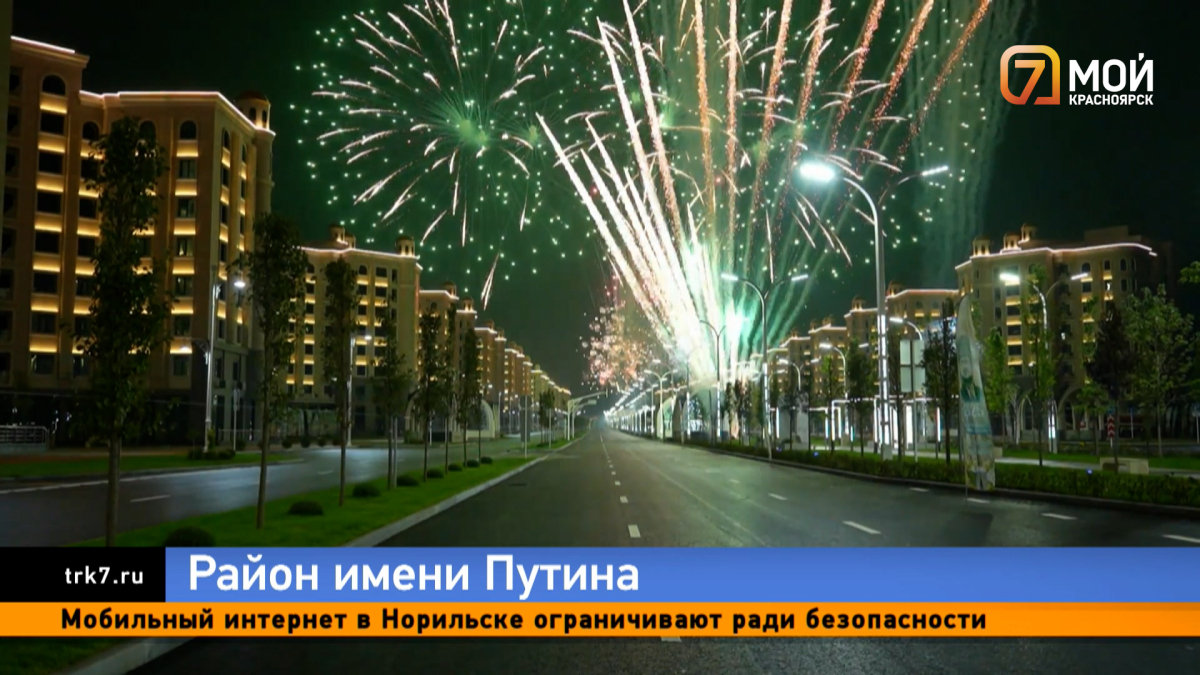 И десятки фейерверков взмыли в небо под торжественную музыку в самом центре кавказского города Грозный. С таким размахом состоялось открытие нового элитного района имени Владимира Путина. Пока что готова только первая линия домов — это 30 высоток в восточном стиле с подсветкой, арочными окнами и башенками на крышах. На одном из таких зданий символично вывели световую проекцию с лицом самого президента — как раз в день его рождения.