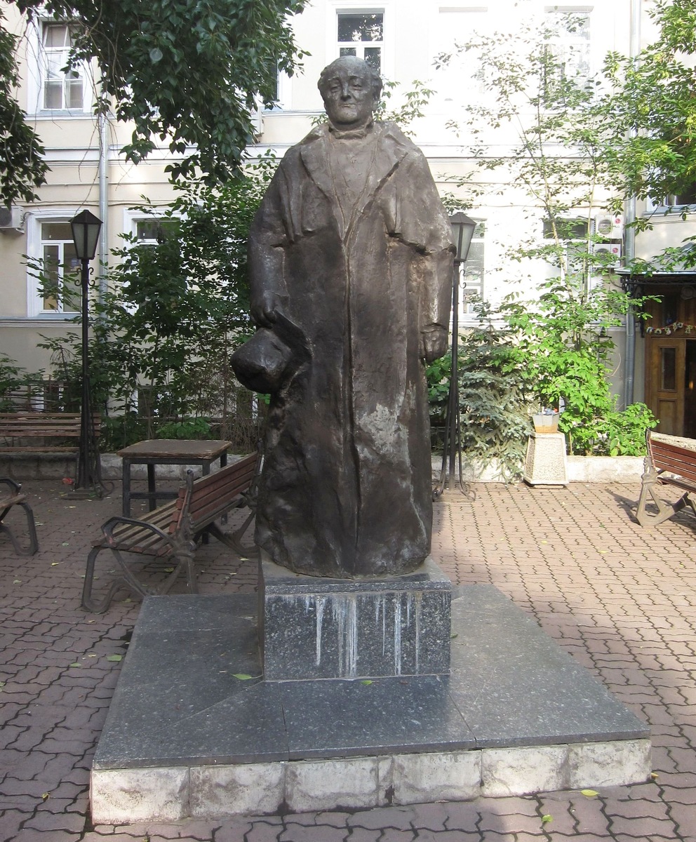 Итак, начнем сегодняшнюю экскурсию с самого центра столицы, а именно с Пушечной улицы, где с 1863 года в здании бывшего Военно-сиротского училища, спроектированного Осипом Бове, располагается старейшее в России театральное училище. В 1932 году ему было присвоено имя Михаила Щепкина, русского актера, одного из основоположников актерской школы в нашей стране, а спустя еще без малого полвека, в 1980 году, во внутреннем дворике училища появился и памятник артисту. Монумент установлен на небольшом постаменте, а сам Щепкин одет в длиннополое пальто и держит в правой руке шляпу-цилиндр. Есть некий символизм в том, что буквально в двух шагах от училища находится Малый театр, который в свое время даже называли Домом Щепкина, а ряд его актеров были выпускниками Щепки. Жаль только, увидеть сам памятник актеру могут немногие: чтобы попасть к нему, нужно пройти через проходную вуза. Сделать это беспрепятственно можно разве что в дни проведения дипломных спектаклей.