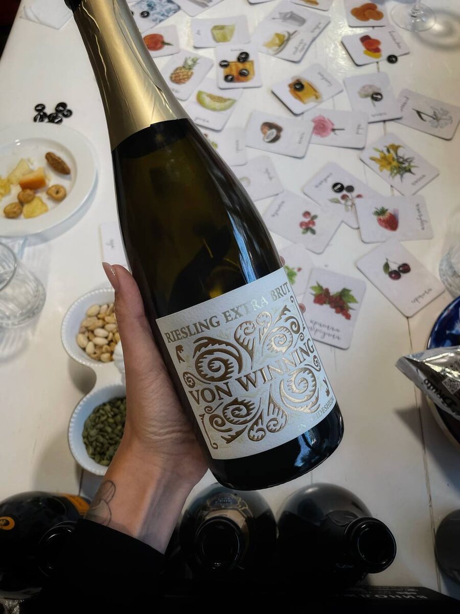 Я НЕ ДОГОВОРИЛА 😅 про позапрошло-пятничную игру-дегустацию В моем личном топе зект на первом месте! Он невероятно ягодный, звонкий, холодный, будто северные ягоды, чуть тронутые утренним инеем. Сначала звучит чисто и прозрачно, как клюквенный лед, а потом неожиданно теплеет, превращается в брусничный пирог с лимоном. Всё это время его аромат обрамлён тёплым ластиком, тем самым, когда ты стираешь карандашные штрихи с наброска. Интересно, что в бутылке соединились три разных года урожая — 2019, 2020 и 2021. Может, поэтому оно кажется таким многослойным: в нём чувствуется и свежесть, и глубина, и что-то будто уже прожитое. 🇩🇪 Weingut von Winning, Riesling in Deidesheimer Extra Brut