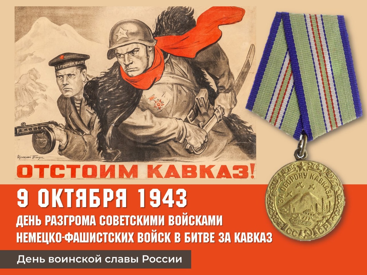 9 октября – День воинской славы России, день разгрома советскими войсками немецко-фашистских войск в битве за Кавказ (1943 г.), одной из самых длительных и кровопролитных битв Великой Отечественной войны, длившейся с 25 июля 1942 года.