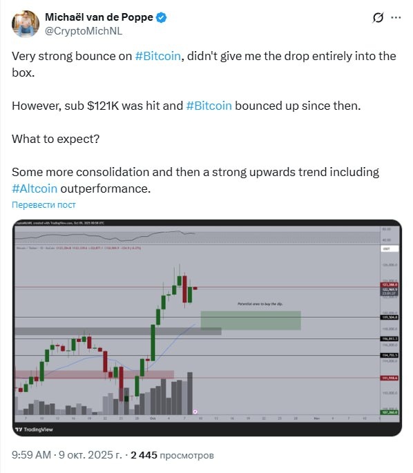 Очень сильный отскок у биткоина, хотя он и не полностью достиг зоны, на которую я рассчитывал. Тем не менее цена опускалась ниже $121 000, и с тех пор биткоин пошел вверх. Что же ожидать? Еще некоторая консолидация, а затем — сильный восходящий тренд, включающий опережающий рост альткоинов.