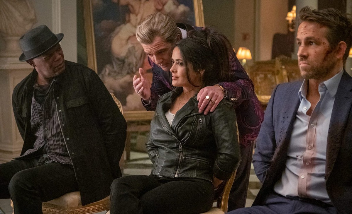 Название сиквела неожиданно довольно успешного комедийного экшна «Телохранитель киллера» — «Телохранитель жены киллера» — незамысловато, впрочем, как и первая часть, обозначает главных героев. К придурковатому дуэту Райана Рейнольдса в образе слишком педантичного телохранителя Майкла Брайса и Сэмюэла Л.Джексона, играющего Дариуса Кинкейда, рискового киллера, любителя выражения «мазафака», добавляется упомянутая еще в оригинале жена Кинкейда — Соня, мошенница, вышедшая из тюрьмы, в ярком исполнении Сальмы Хайек. Так что семейных ценностей в этом фильме не избежать, что, впрочем, сиквелу пошло только на пользу. Майкл Брайс, униженный и оскорбленный, начисто лишенный профессиональной лицензии, мучается ночными кошмарами, где ему вручают награду как телохранителю года, только вот среди зрителей только один ненавистный Кинкейд — то ли друг, то ли враг, то ли клиент, то ли работодатель. Как современный взрослый человек Брайс борется с кошмарами походами к психотерапевту, которая уже, кажется