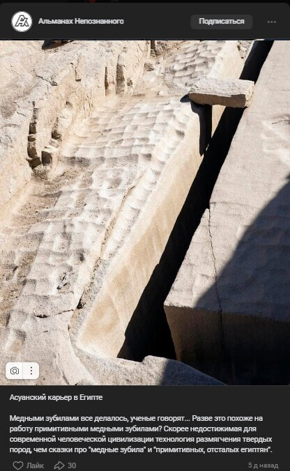 Вот только медные зубила не виноваты в проблемах альтернативщиков, они всего лишь есть, как и каменные молоты и каменные топоры, которыми испокон веков работали люди, пытаясь обрабатывать камень, а вот лазерной болгарки или чего-то похожего нет ни в качестве находок, ни в качестве изображений.